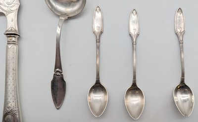 PETIT LOT en argent (950) et argent (950) fourré comprenant trois cuillères à moka, une cuillère à sauce à cuilleron en métal doré, une cuillère à bonbon, une petite spatule (Puiforcat).