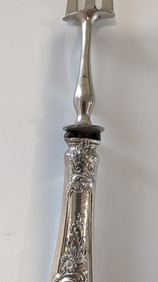 DEUX FOURCHETTES A GIGOT à manche en argent (950) fourré, l'une à décor guilloché à bague de protection à forme de tête de sanglier, l'autre à décor de fleurettes.