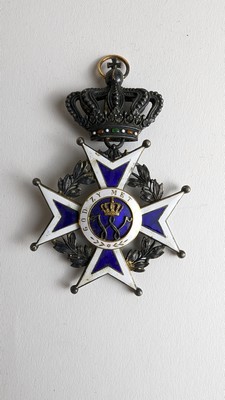 CROIX D'OFFICIER en argent et vermeil à motifs d'une croix de Malte émaillée bleu et blanc fileté à l'or sous couronne émaillée de points blancs, rouges et verts. A l'avers le lion avec devisz "Je Maintiendrai" et au revers un W sous couronne avec devise.
