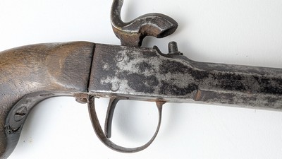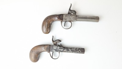 DEUX PISTOLETS A COFFRE. Système à percussion. Canon à pans. Crosse en noyer.
