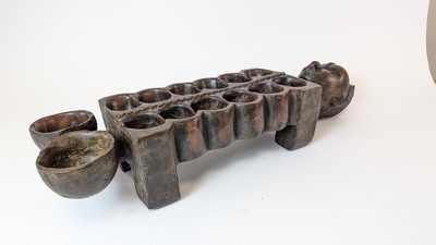 JEU D'AWALE en bois sculpté à patine sombre, reposant sur quatre pieds droits et deux rangs de six cases partagés par un motif de cordelette. Les deux extrêmités sont sculptées l'une d'une tête humaine au cou annelé et l'autre d'une paire de grandes cases utilisées comme réserve à graine.