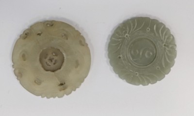 DEUX MÉDAILLONS ou BI, en jadéite céladon sculptée, de forme circulaire, l'élément central mobile.