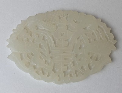 MÉDAILLON lotiforme en jadéite blanc ajouré et sculpté à décor d'un idéogramme flanqué de daims ou chimères.