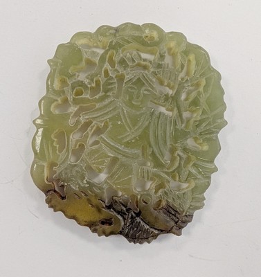 MÉDAILLON en jadéite vert et brun ajouré et sculpté à décor d'un personnage sur oiseau et chimère.