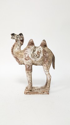 SCULPTURE en terre cuite patinée représentant un chameau au naturel reposant sur une base rectangulaire. Traces de polychromie.