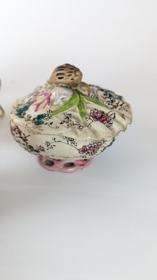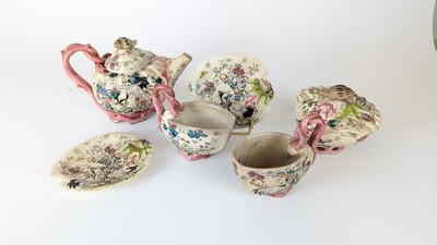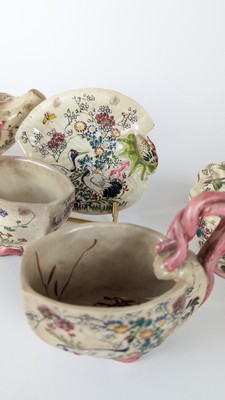 PARTIE DE SERVICE A THE conchiforme en céramique émaillée polychrome à décor de grues, fleurs des champs et crustacés comprenant une théière, un sucrier et deux tasses.