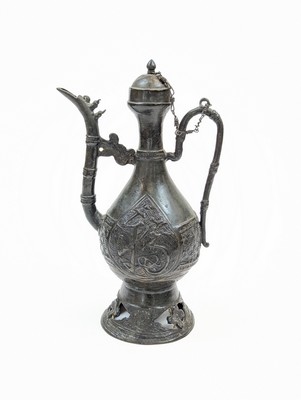 THÉIERE balustre en bronze patiné à décor ciselé sur la panse d'idéogrammes dans une réserve. Base circulaire à décor ajouré.