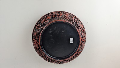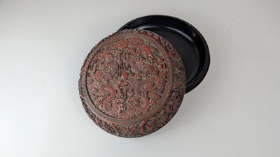 BOÎTE lenticulaire dans le goût des laque de cinabre, à décor de deux dragons à cinq griffes dans des nuées poursuivant la perle sacrée, bordures à décor de bouquets de fleurs dans des réserves alternées d'artefects, sur fond de crosillons.