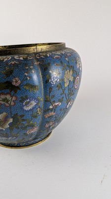 CACHE-POT en bronze et émaux cloisonnés à décor de branches de lotus fleuris et papillons sur fond géoumétique.