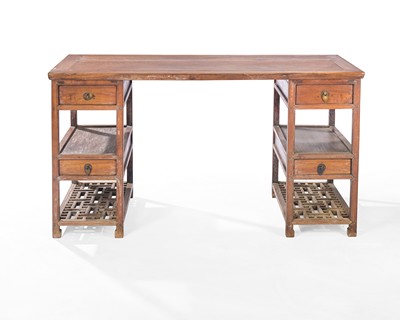 BUREAU formé de deux caissons en bois mouluré ouvrant à deux tiroirs latéraux sur deux niveaux et tablette d'entretoise ajourée.