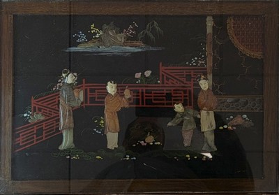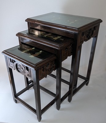 SUITE DE TROIS TABLES GIGOGNES en bois à plateau en incrustation de nacre à décor de personnages dans des pagodes.