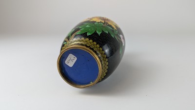 VASE balustre en émaux cloisonnés à fond noir et à décor d'un hortensia survolé d'un papillon.