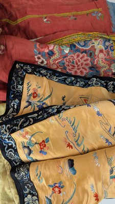 ENSEMBLE DE BRODERIES sur soie, dont veste, dessus-de-lit et divers éléments à décor d'enfants jouants dans des paysage ou oiseaux et insectes.