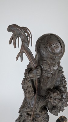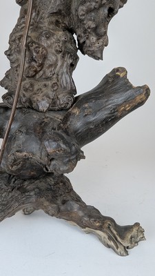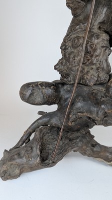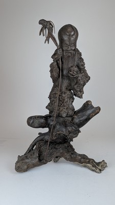 SCULPTURE en racine de bois sculptée représentant Shou Lao appuyé sur son bâton et tenant dans sa main gauche une perle de longévité.
