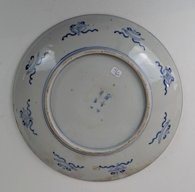 PLAT rond en porcelaine émaillée Imari, à décor de panier fleuri sur un tabouret et phénix. Marque d'atelier en bleu au revers.
