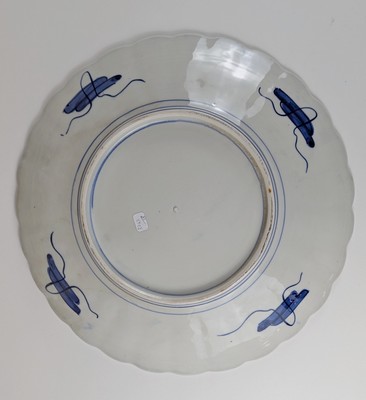 PLAT en porcelaine émaillée à bord polylobé et à décor Imari de motifs floraux en réserve. Le bassin à décor en réserve d'un panier fleuri. Le marli cannelé.