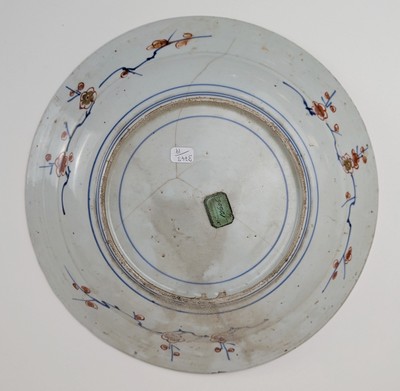 PLAT circulaire en porcelaine émaillée à décor Imari d'un vase fleuri dans le bassin. L'aile à décor dans des réserves de motifs floraux symétriques.