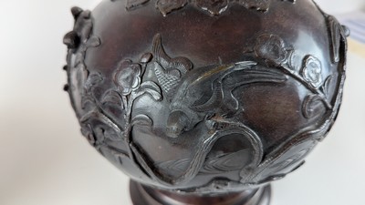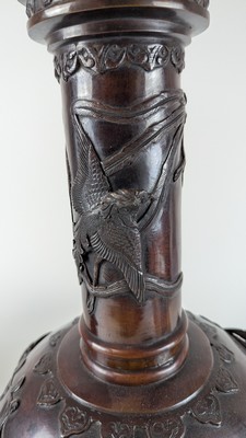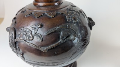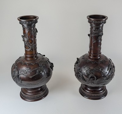 PAIRE DE VASES à haut col sur talon, en bronze ciselé à décor sur la panse d'oiseaux branchés.