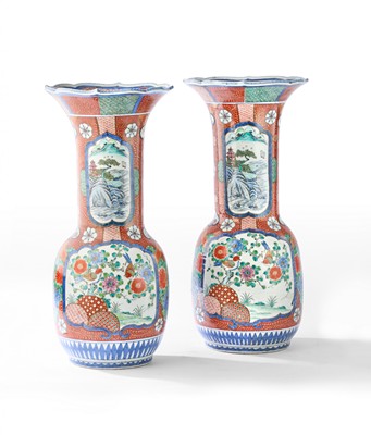 PAIRE DE GRANDS VASES à haut col chantourné, en porcelaine émaillée polychrome à décor en réserve de paysages lacustres avec pagodes et montagnes sur le col et oiseaux branchés sur le corps. Le fond à décor de motifs géométriques et fleurs.