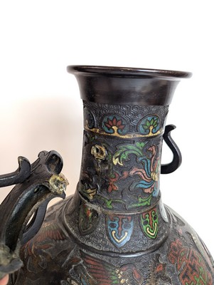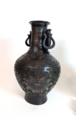 PAIRE DE GRAND VASES BALUSTRES en bronze et émaux champlevés à décor de fleurs de lotus épanouis, rinceaux feuillagés et phénix, le col orné de dragons stylisés.
