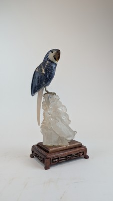 PERROQUET perché, en pierre dure sculptée, sodalite et quartz.
