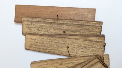 LIVRE DE PRIÈRE manuscrit sur papier monté en accordéon relié par deux plaquettes en bois.