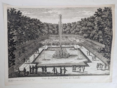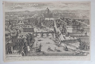 RECUEIL COMPOSITE comprenant des estampes du XVIIe au XIXe siècles sur l'Italie, vues de Venise ou d'autres villes, table édité chez N. Bonnart, deux scènes de chasse d'après Huet, scènes de genre ou sujets historiques d'après Le Prince, paysages d'après Ruysdaël ou Calame, maison de paysan Canton de Berne, vues du château Saint-Ange, de la villa Pamphile par Aveline, de l'église Notre-Dame de Paris édité par Aveline (retirage, usée), paysage de Perelle, vues d'optique du monastère du Val de Grace, Bastille, vues XVIIe de Versailles ou Chantilly, portraits (dont Fouché), sujets religieux (saints par Le Clerc ou Sadeler), scènes de genre (dont d'après C. Troost) ou historiques, vue du Breitenstein, musiciens d'après J. Boydell gravé par J. Haid...