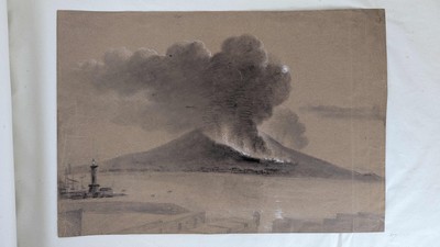 ET Vue du Vésuve en éruption, fusain et craie blanche, 22 x 33 cm.