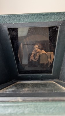 AUTOCHROME représentant une femme assise accoudée, avec visionneuse diascopique pliante à soufflet et miroir.