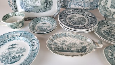 PARTIE DE SERVICE DE TABLE en faïence fine à décor imprimé en camaïeu vert de scènes et paysages à la Turque, bordures à décor de pampres de vigne et oiseaux en réserve, comprenant :