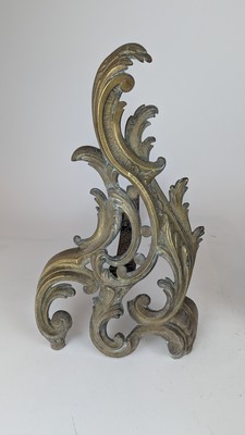 PAIRE DE CHENETS en fonte de fer et bronze à décor rocaille de rinceaux feuillagés en enroulement.