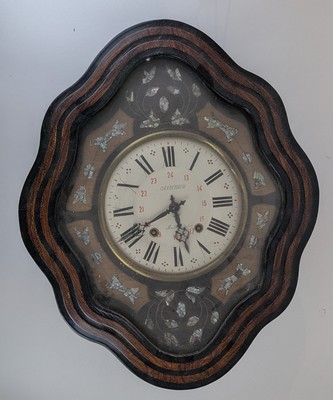 CARILLON dit oeil-de-boeuf de forme contournée en marqueterie de bois teinté noir et loupe. Le cadran émaillé à chiffres romains et arabes en relief signé "Ganachaud Montreuil Bellay" dans un encadrement en marqueterie de nacre.