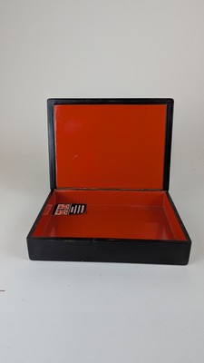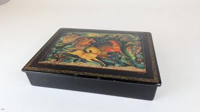 BOÎTE rectangulaire en bois laqué à fond noir à décor sur le couvercle d'une scène de Troïka dans des nuées d'après Dostoievski. Signée.