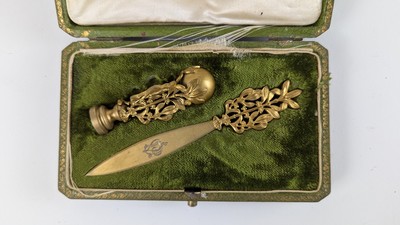 CACHET ET COUPE-PAPIER en bronze ciselé à décor ajouré sur le manche de feuilles de branches de gui. Chiffré VP sur le manche et le cachet. Ecrin.