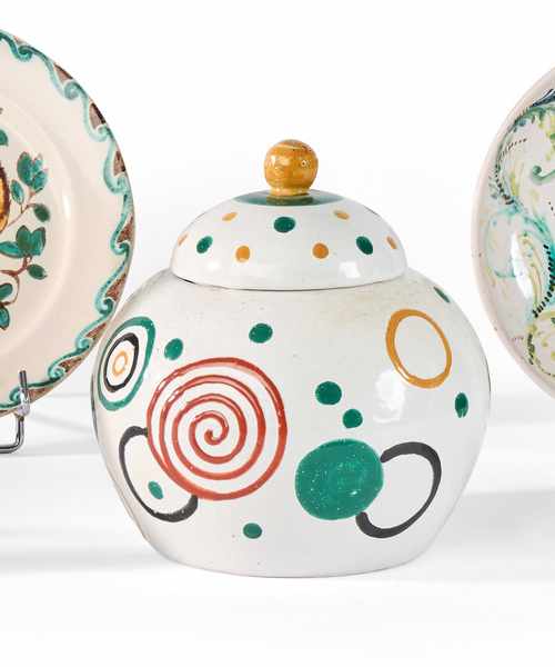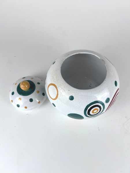 Épreuve en céramique émaillée ; le décor titre réparti sur la base et le couvercle et traité polychrome sur fond blanc craquelé. Années 1920.