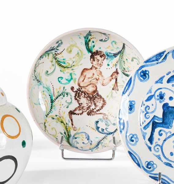 ASSIETTE creuse en céramique émaillée polychrome à décor dans le bassin d'une petit faune tenant dans sa main un instrument à vent.