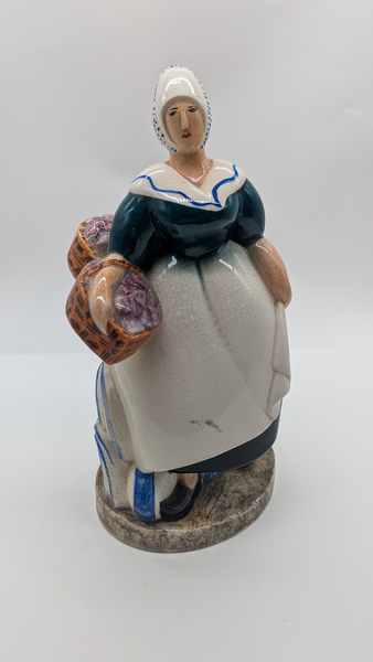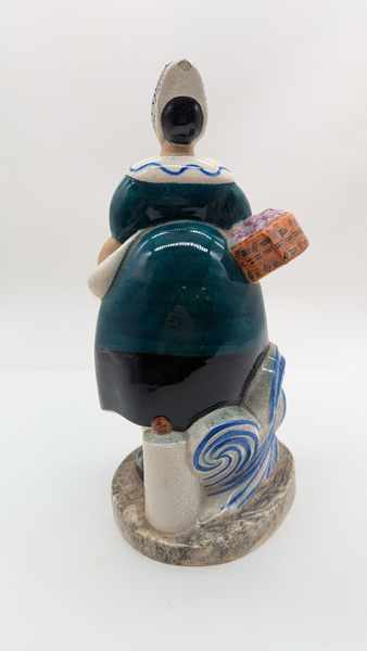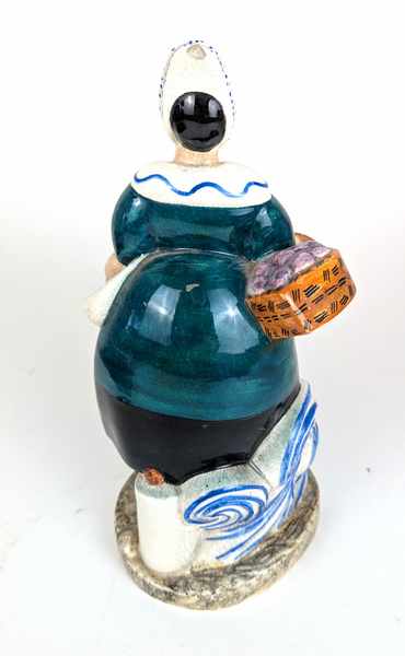FIGURINE en faïence émaillée polychrome représentant une femme au panier double, marchande de fleurs, stylisée Art Déco.
