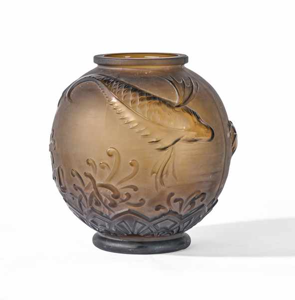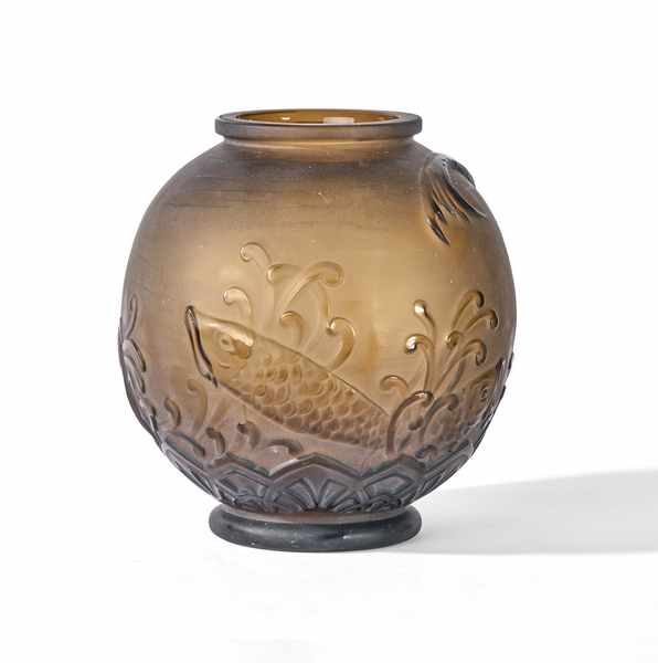 GRAND VASE boule en verre teinté brun, moulé pressé, à décor tournant de poissons volants sur fond marin stylisé et palmettes à la base. Traces de signature en relief et en rouge.