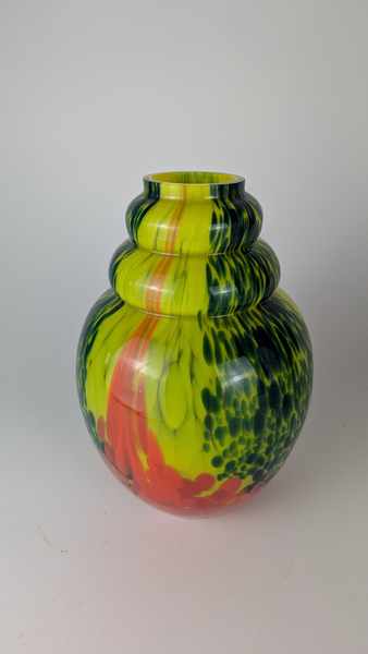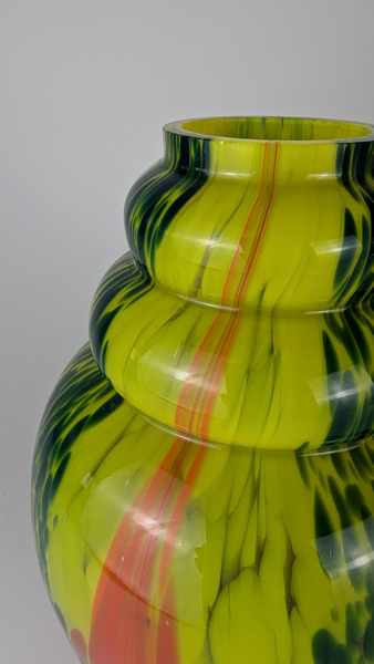 VASE ovaoïde à col renflé en verre soufflé marmoréen rouge et vert sur fond jaune. Signé au tampon.