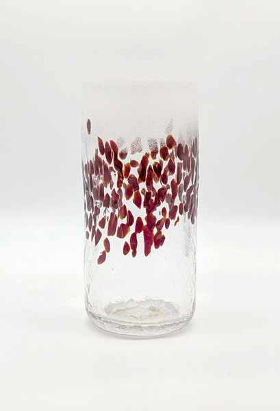 VASE rouleau en verre soufflé en trois parties givrée, translucide et craquelé à décor en applique de motifs abstraits ocres. Signé à la base.