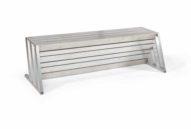 Epreuve de forme trapézoïdale en aluminium riveté à assise rectangulaire. Les montants inclinés à lattes alternées sur les côtés.