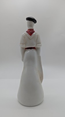 BOUTEILLE en forme de pelotari en verre opalescent, réhaussé noir, rouge et jaune. La tête formant bouchon.