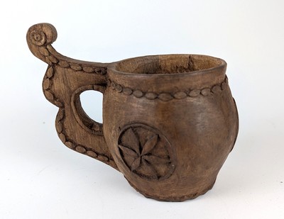 BOL DE BERGER monoxyle à une anse chantournée et à décor sculpté de croix basque, rosaces et frise.
