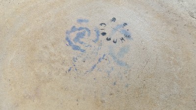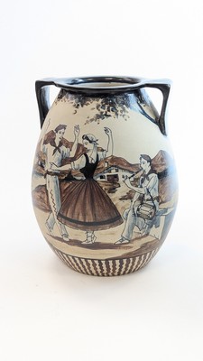 VASE bursiforme à anses droites en grès émaillé polychrome à décor tournant de Fandango et paysage basque avec pont romain. Signé Garcia de Diego et marqué au tampon.