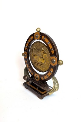 GONG circulaire en bois, laiton et bronze, à décor du Zazpiak Bat soutenu par deux gants de chistera.