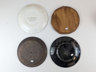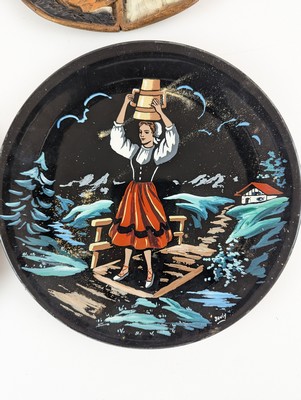 ENSEMBLE DE QUATRE ASSIETTES en céramique ou bois sculpté à décor de danseurs, paysannes, vieux basques et de l'écusson du Zazpiak Bat.