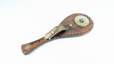 BAROMETRE en forme de pala en bois sculpté à décor de clous et croix basque, ornée d'une chistera en bronze.