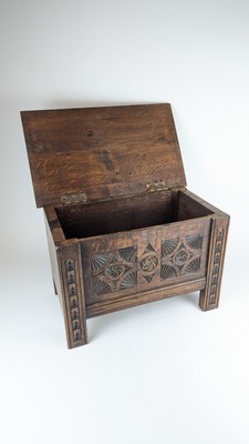 PETIT COFFRE ou KUTXA MINIATURE rectangulaire en chêne sculpté de rosaces enserrant un étoile juive au centre.
