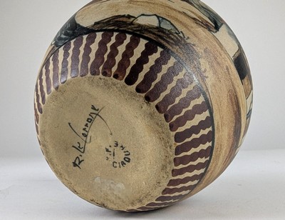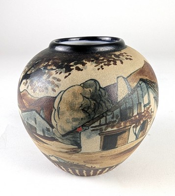 VASE boule en grès émaillé polychrome à décor d'amatxi et aitatxi sur fond de paysage basque.