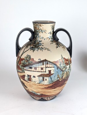 GRANDE AMPHORE en grès émaillé polychrome, à décor d'une famille de Basques sur fond de paysage. Marquée au tampon et signée H. Moreau.